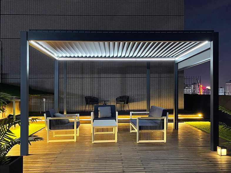 Remanso Luxury Pergolas are constructed from heavy duty powder coated aluminium with a fully automatic opening and closing louvre-style roof.